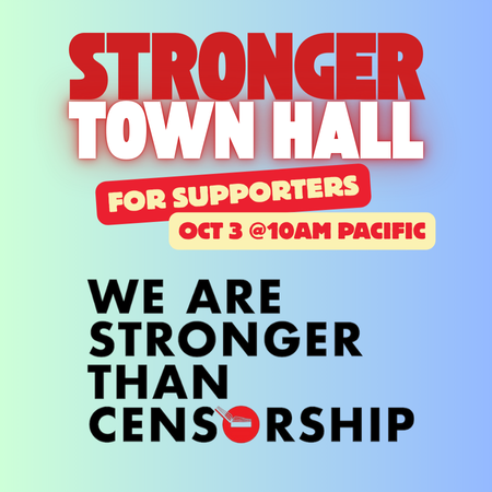 1) You’re invited to join us for the We Are Stronger Than Censorship Town Hall for Supporters on Friday Oct 3, 2025 at 10am Pacific! It’s a one-hour online community event where we’ll share the latest on the program, answer your questions, and crowd-source your ideas for scaling up the fight for the freedom to read!